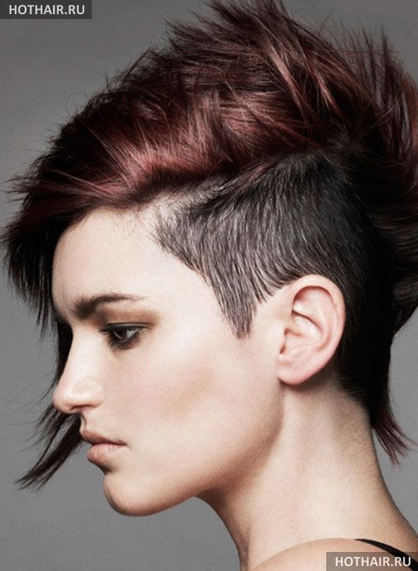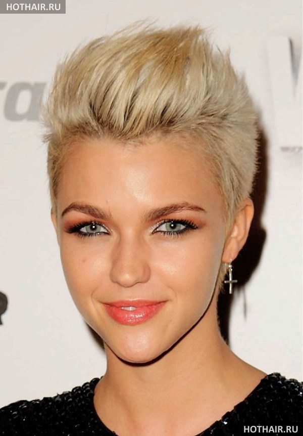 Стрижка ежик может подчеркнуть образ панка, если волосы на макушке поставить ирокезом с помощью геля или лака для волос. Также очень дерзко выглядит эффект хаоса, когда верхние пряди небрежно уложены в разных направлениях. Виски не редко выбриваются.