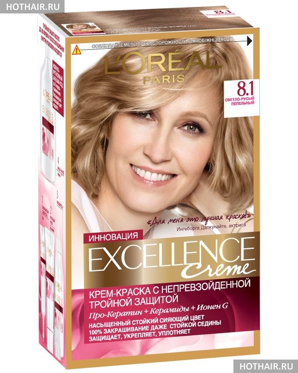 - Краска для волос Лореаль, L’oreal – профессиональная косметика французского происхождения, считается одной из самых лучших красок массового производства (светло-русые оттенки начинаются с цифр 8 и 9 – 8, 801, 9.1, 910);