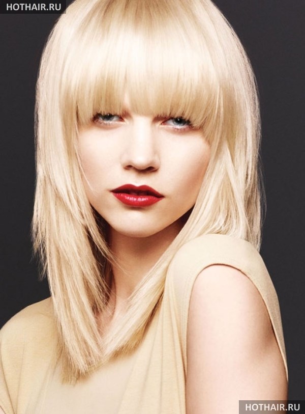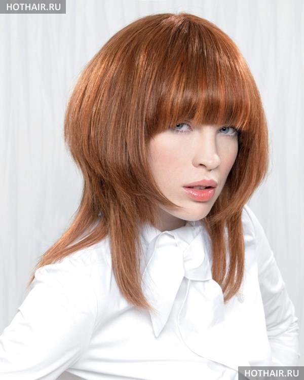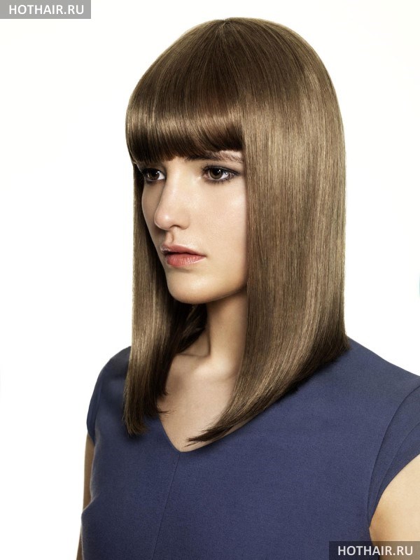Это двухслойная стрижка, сочетающая в себе две длины волос. Нижний слой может быть четко и ровно постриженным, а может быть ступенчатым. Что касается верхнего слоя, тут уже все делается строго по прямой линии. Челка для этой стрижки подойдет ровная, она придаст прическе четкость и выразительность. Эта прическа идеально подойдет для тонких волос, придаст им объем и пышность. Если у вас и так от природы густые волосы, от этой прически лучше всего воздержаться.