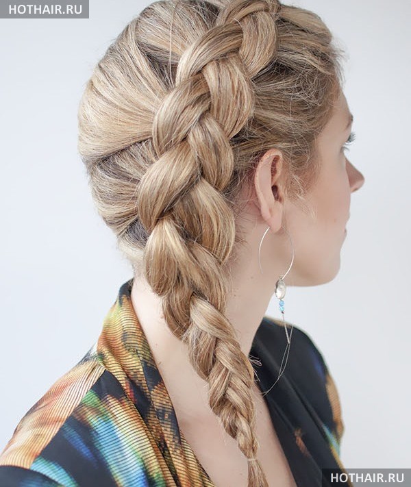 Такая прическа выполняется зигзагом, который проходит по всей голове. Когда плетение у корней окончено, оставшийся хвост «забирают» в резинку и при желании завивают его. Отметим, что поскольку такая прическа полностью открывает лицо, то подходит она не всем. Ее можно выполнять девушкам с правильными чертами лица и овальной формой. Во всех остальных случаях она выставит напоказ все недостатки, в том числе оттопыренные уши.