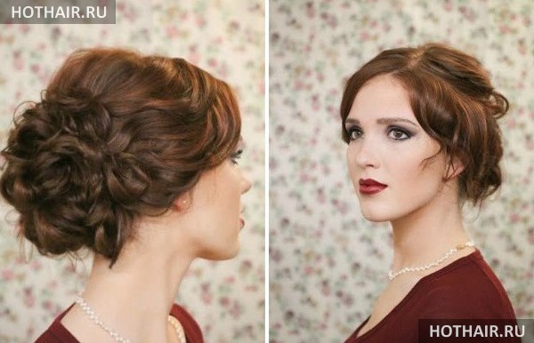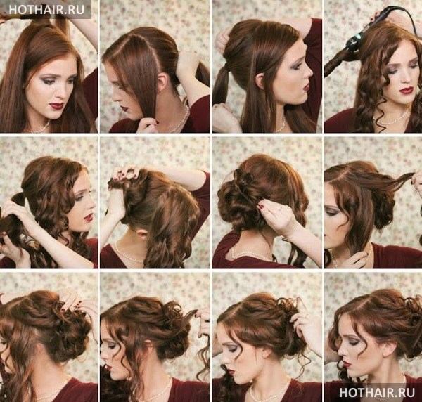 В данном случае также потребуется выполнить завивку локонов, но только не всей их длины, а только кончиков. После этого все волосы фиксируются в хвост, но при последнем протаскивании не следует вытаскивать все локоны. Нужно оставить кончик, который несколько раз проворачивается вокруг пучка. Данная прическа может быть выполнена как в будний, так и в праздничный день.