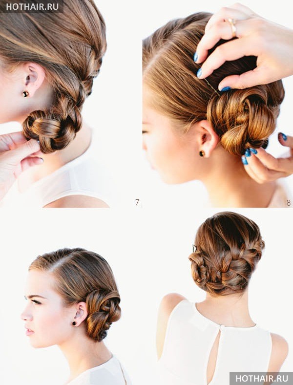 Для выполнения данной прически вам следует заплести косу в классическом стиле, несколько раз ее обернуть вокруг и зафиксировать шпильками. Эта строгая прическа подходит тем девушкам, у кого строгий дресс-код на работе, но вместе с тем хочется разнообразия.