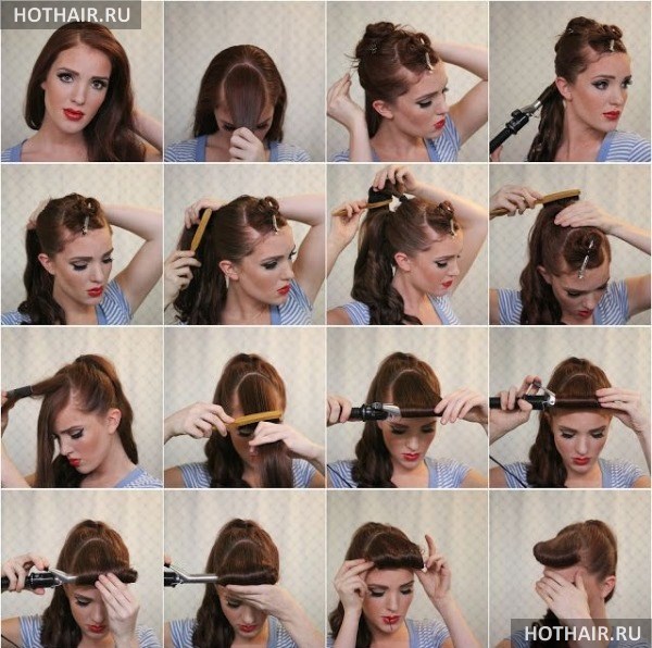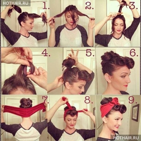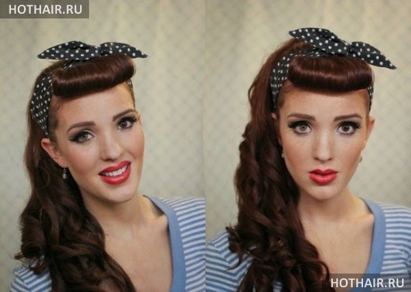 Данную прическу можно так же отнести к стилю ретро, но в данном случае речь идет о 50-ых годах прошлого столетия. Она имеет и второе название – стиль Рокабилли. Данная укладка подойдет для смелых натур, так как она смотрится весьма экстравагантно. Также ее можно делать на тематические вечеринки. В данном случае из волос делаются завитки, которые следует хорошенько зафиксировать. Для этого вам потребуется шпильки и лак для волос для сильной фиксации. После того, как вы выполнили завитки из локонов, следует обернуть прическу повязкой. Отметим, что данный аксессуар должен быть широким и иметь яркий цвет. Следует знать, что украшать повязку должен большой бант, завязанный впереди прически.