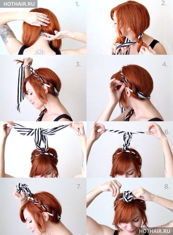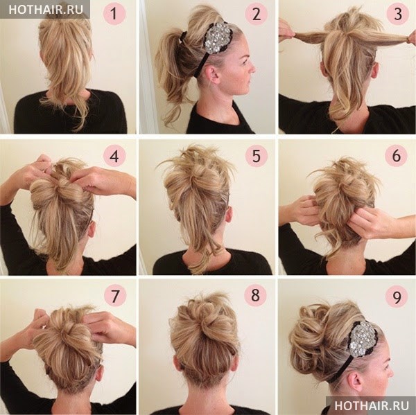Чтобы выполнить такую прическу, вам нужно будет сделать начес на всех прядях по всей длине. Основная масса волос должна быть сосредоточена на макушке, поэтому подобная прическа не подойдет девушкам с удлиненным типом лица. Однако если вы мечтаете именно о такой прическе, то просто не выполняйте начес на макушке. Вы можете немного отойти от правил, но получите желаемый результат. После того, как выполнен начес, нужно обернуть повязку вокруг головы. Отметим, что спереди следует выпустить несколько прядей, а узел прятать под прическу.